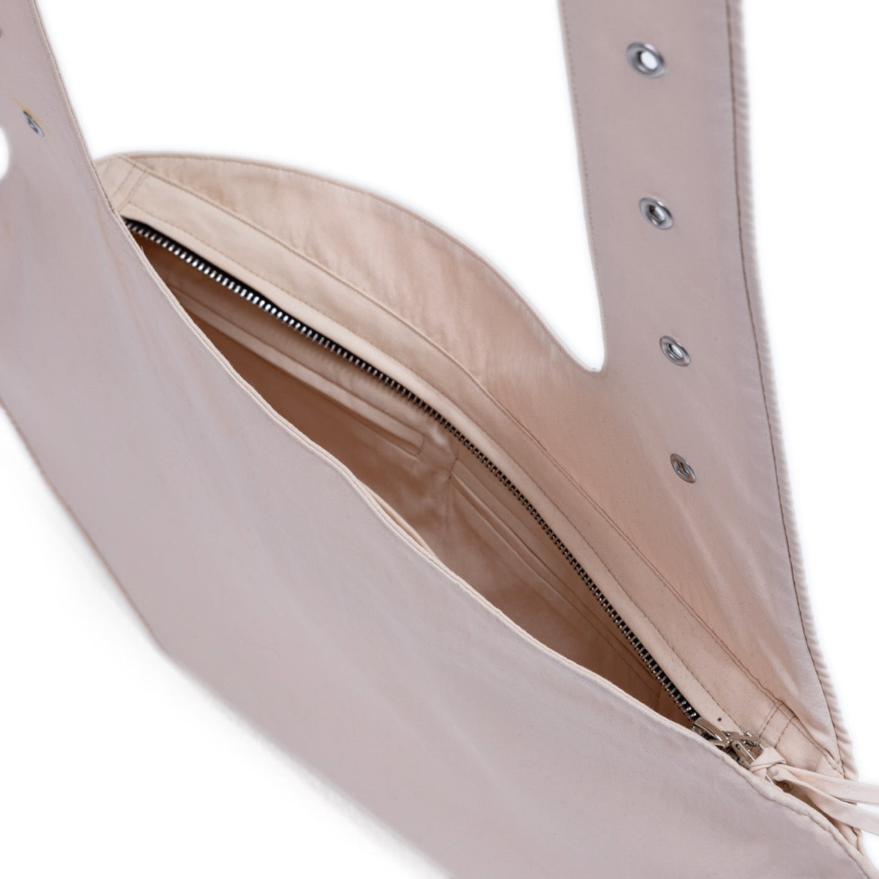 silhouette and flared base. - Features an elongated shoulder strap with metal eyelet detailing.